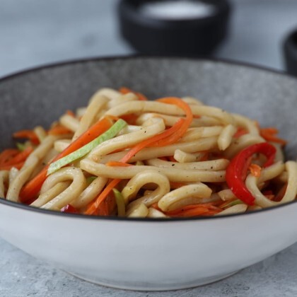 Лапша удон ручной работы, креветки, заправка терияки, кунжут, перец сладкий, пекинская капуста, кабачки, морковь, соус сладкий чили
