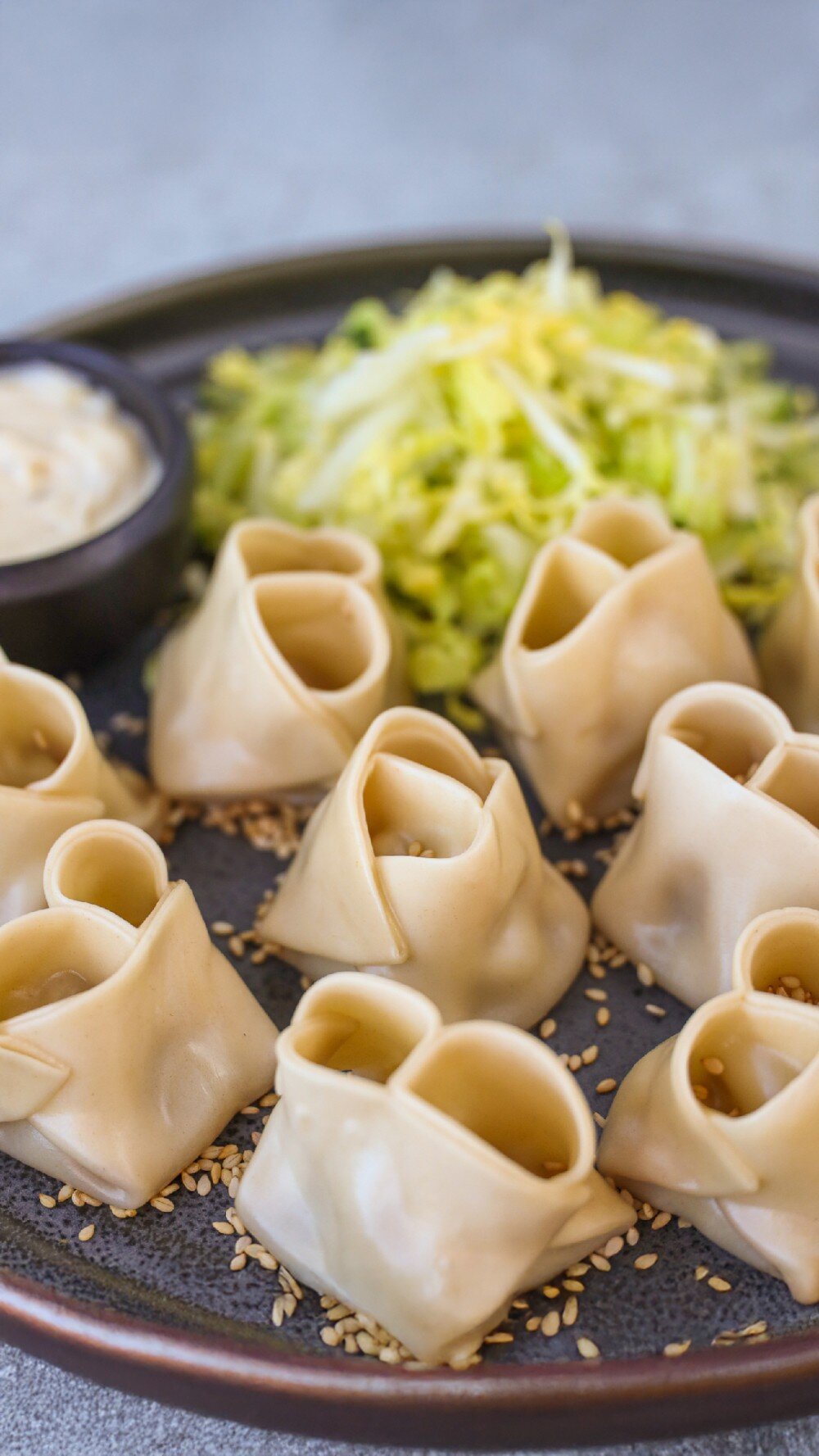 Тесто, свинина, капуста кимчи, заправка терияки, соус спайси, огурцы свежие, капуста китайская, кунжут